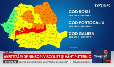 Meda Andrei, meteorolog ANM: În zilele care urmează se anunță precipitații atât sub formă de ploaie în zonele joase din partea de sud, de sud-est a țării, dar și lapoviță și ninsoare în vest, în nord, în centru. De asemenea în zonele de munte, cu cât urcăm la altitudini mai mari, cu atât o să fie mai multe ninsoare. De asemenea o să fie și intensificări ale vântului în acest weekend în sudul Moldovei, jumătatea de est a Munteniei, în Dobrogea. Viteze la rafală în general de 55-60 de km la oră, 70 de km la oră, iar mâine noapte o să avem și un interval în care să se asocieze ninsoarea cu vântul. Prin urmare în Ialomița, Călărași, Tulcea și Constanța să fie perioade în care această ninsoare să fie viscolită. Vom tot felul de evenimente meteorologice acestea nu par grave în momentul de față, nu ies în evidență ținând cont că suntem în luna decembrie și sunt cât se poate de normale
